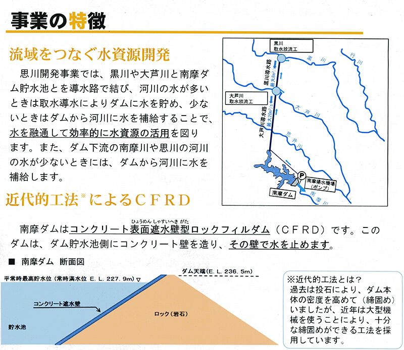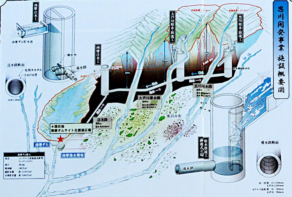特徴: 異なる河川を導水路で結ぶため、川の流量が少ない時に南摩ダムから水を補給する逆流機能も持つ