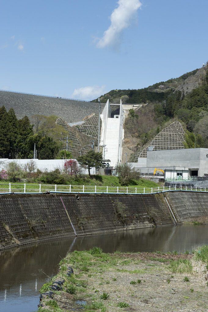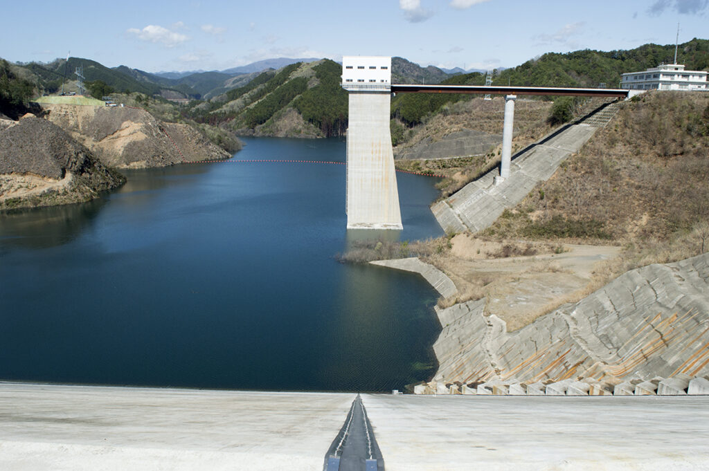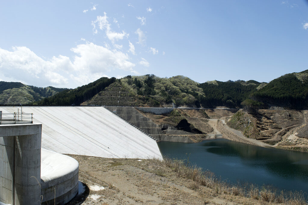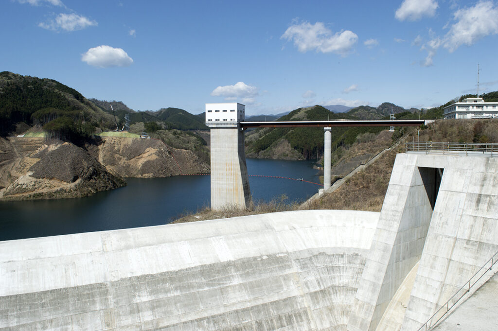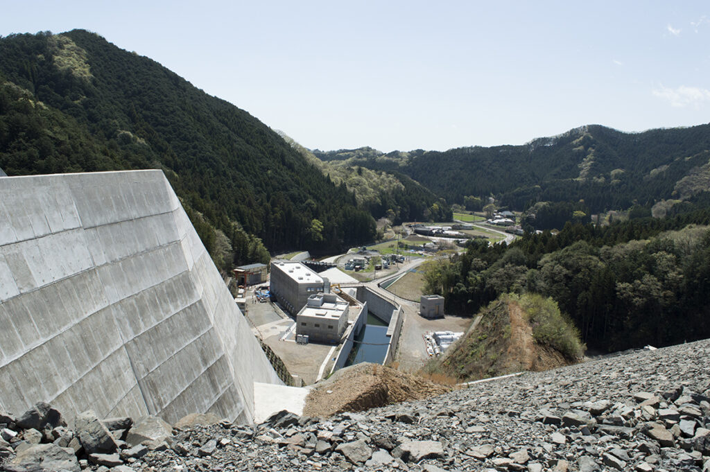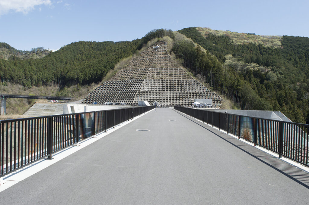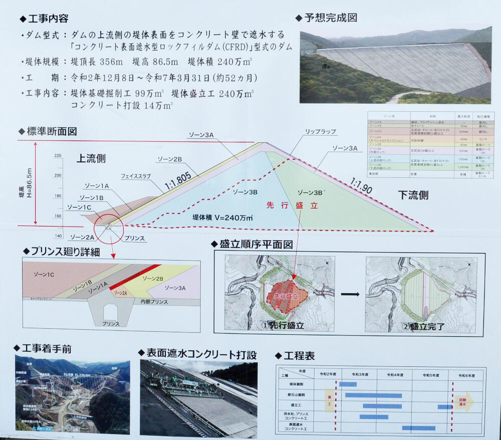 岩石を積み上げた堤体の上流面をコンクリートで覆う構造が特徴で、この型式としては日本最大規模(堤高86.5m、堤頂長359m)となります。