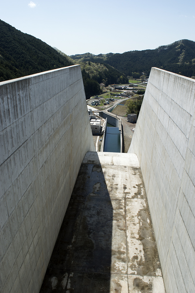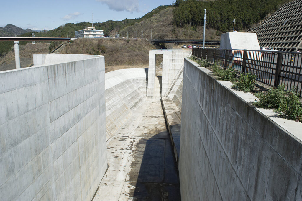 ※ 南摩ダム(栃木県鹿沼市、思川開発)の洪水吐きは、大雨時にダムへ流入する水を安全に下流へ流す、高低差約80m、全長約400mの広大なコンクリート構造物です。