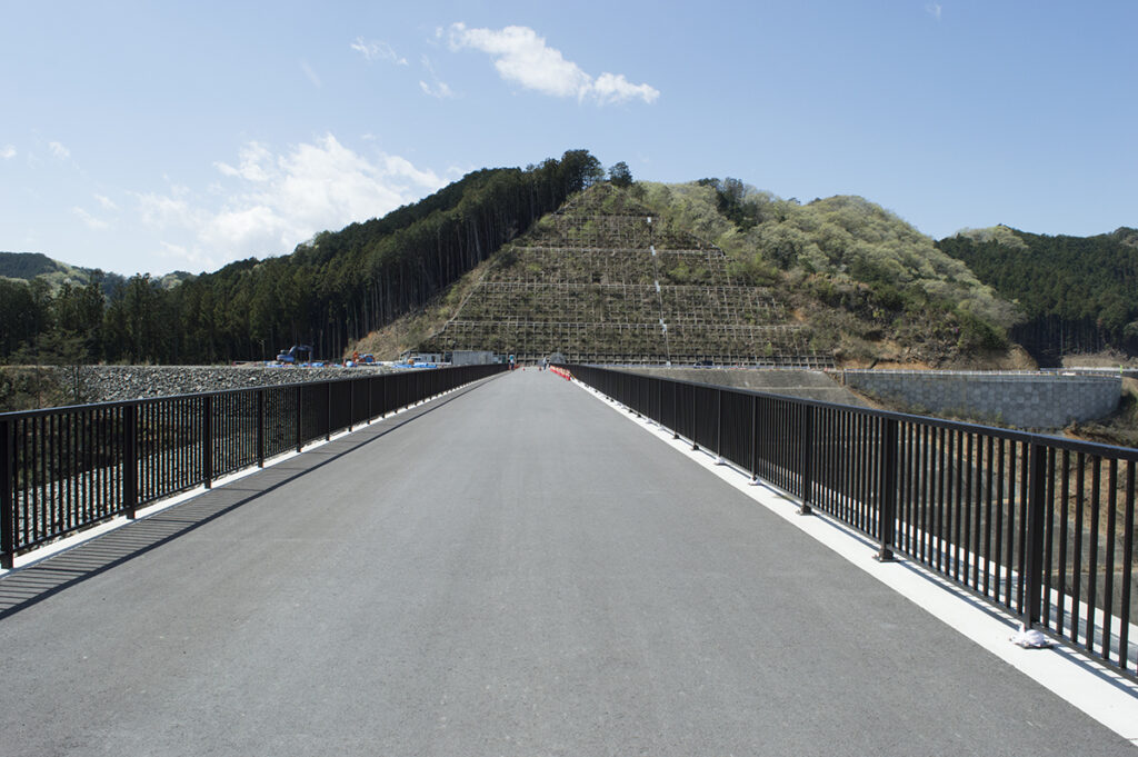 上は、天端通路中央付近より見た付け替え道路寄りです。