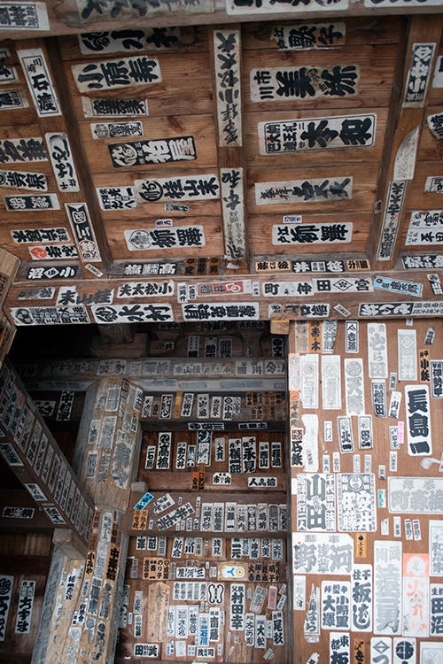 入り口付近の壁や天井には千社札が沢山貼られていました。