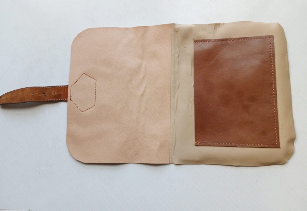 スマフォや小物などを入れるため傷にならない様にスエード革で裏張りしてみました。