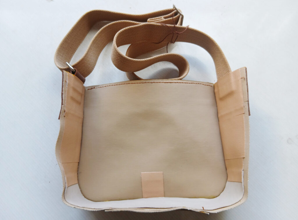 下は、マチ上部に革を貼ってベルトの取り付け部分を強化してみました。