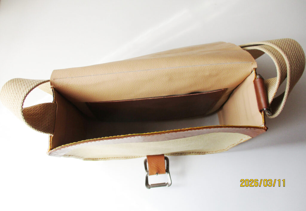 ベージュの帆布製で濡れても良いようにビニールで内張がしてありました。