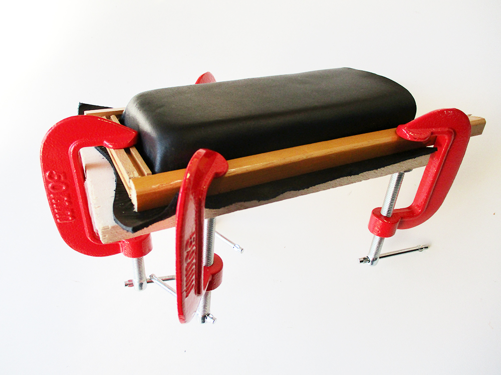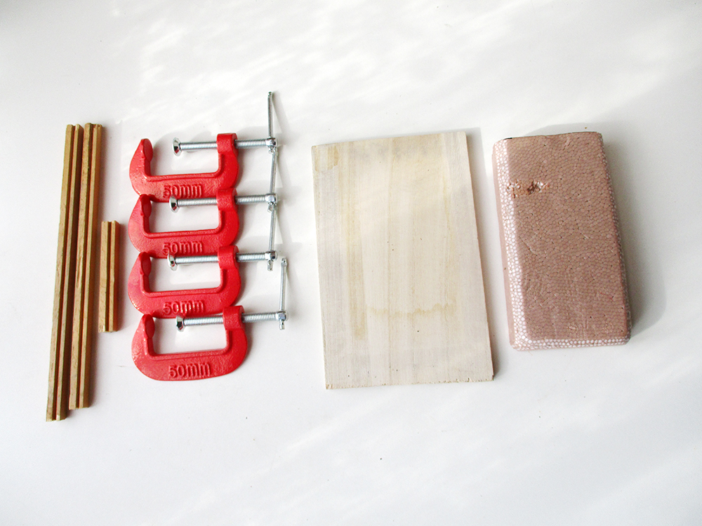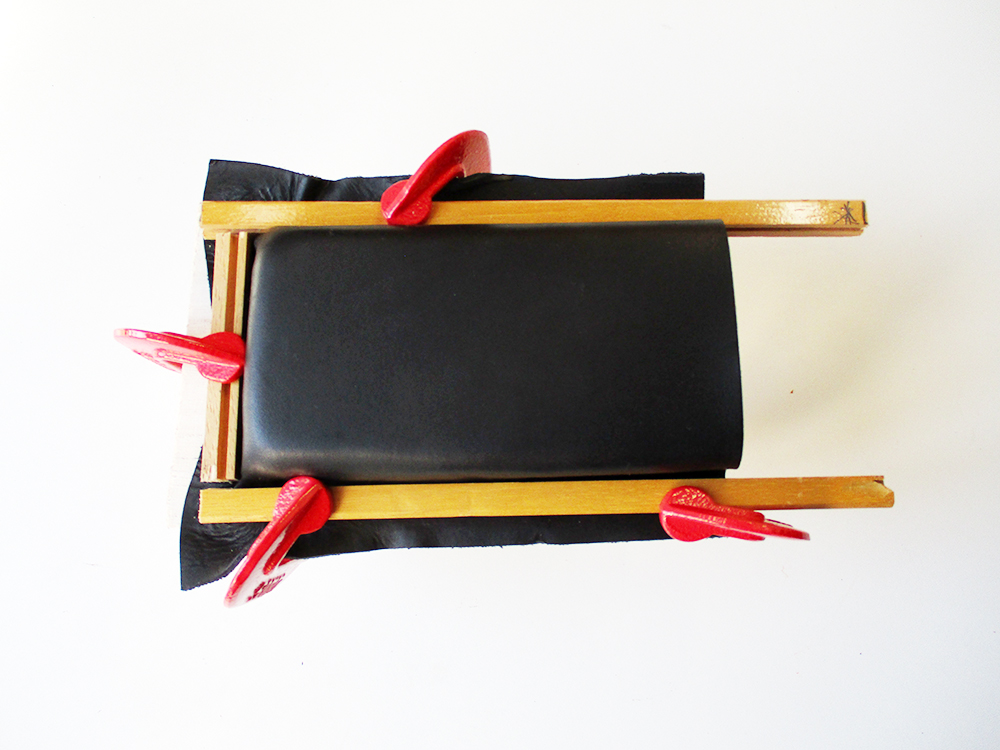 下は、革を30分ほど水に浸して柔らかくした後、発泡スチロールの型にクランプで固定して一晩乾燥。