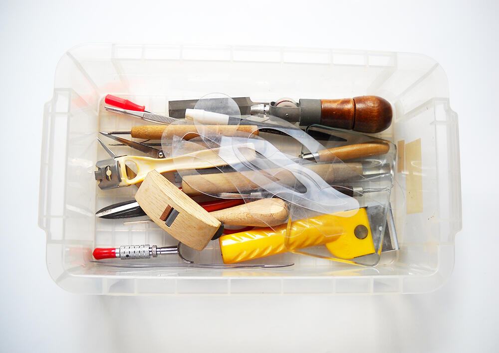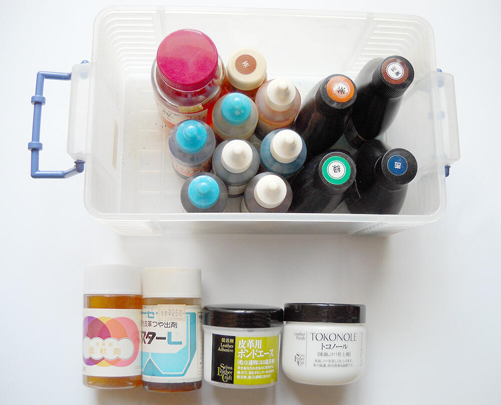押入れの奥を探すとレザークラフトの工具や染料、使い残しのレザーがたくさん出てきました。