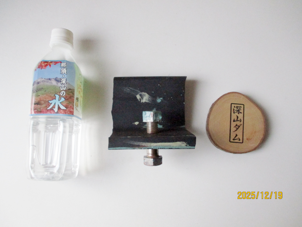 ペットボトルに入った那須深山の水、ダムの遮水ゴムパッキンの切れ端とボルトナット、深山ダムの刻印が刻まれた木片です。
